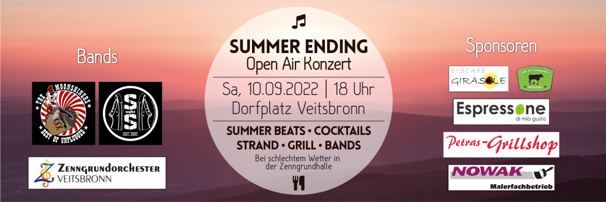 Heiße Beats und sommerliche Vibes – dafür hat sich das Summer Ending einen Namen gemacht. Und dem wollen wir auch dieses Jahr wieder alle Ehre machen und den Sommer gebührend ausklingen lassen: Am 9. September 2023 steigt das Open Air am Veitsbronner Dorfplatz.